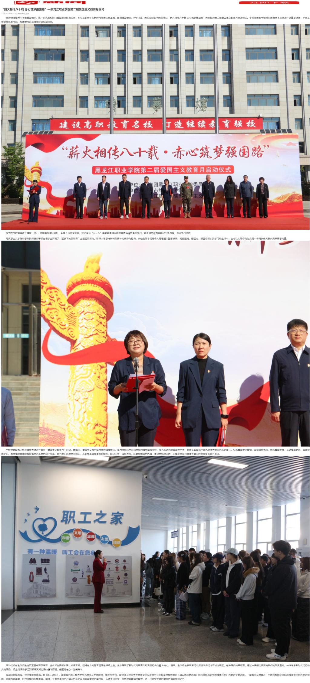 9月29日,学校2025级新生开学典礼暨军训成果展示、“龙职”奖颁奖大会隆重举行。校长王利文,党委副书记杨东辉,副校长吴艳秋、何志鹏,纪委书记陈玉平,副校长王广文,党委委员、组织部部长石明杰,承训部队代表杨冰、陈正极出席活动。大会由杨东辉主持。伴随着雄壮的中华人民共和国国歌,大会正式拉开帷幕。当激昂的《分列式进行曲》响彻运动场,学校军训团9个营、53个连队依次通过主席台,接受全场检阅。各营相继展示了刺杀....