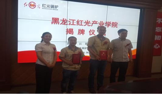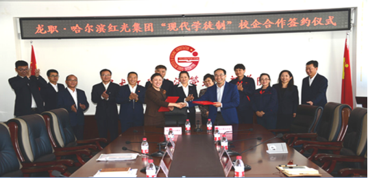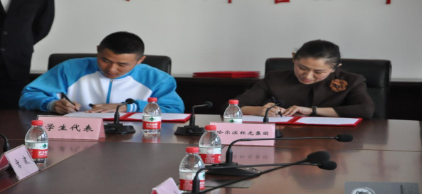 图3哈尔滨红光锅炉集团徐燕总经理与学生共同参加现代学徒制三方签约仪式