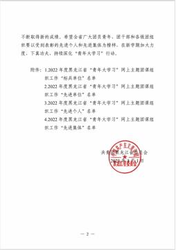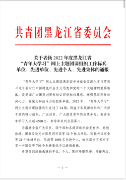 我院团总支书记唐志勇、团总支学生副书记郝志丛,荣获2022年度黑龙江省“青年大学习”网上主题团课组织工作“先进个人”荣誉称号。