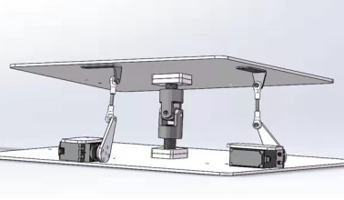该平衡系统采用双支撑臂和一个万向节组成的并联机构,电子陀螺仪检测驾驶室全方位倾斜角度,并通过PID算法控制并联机构,修正驾驶室角度,实现360°全方位驾驶室水平。
