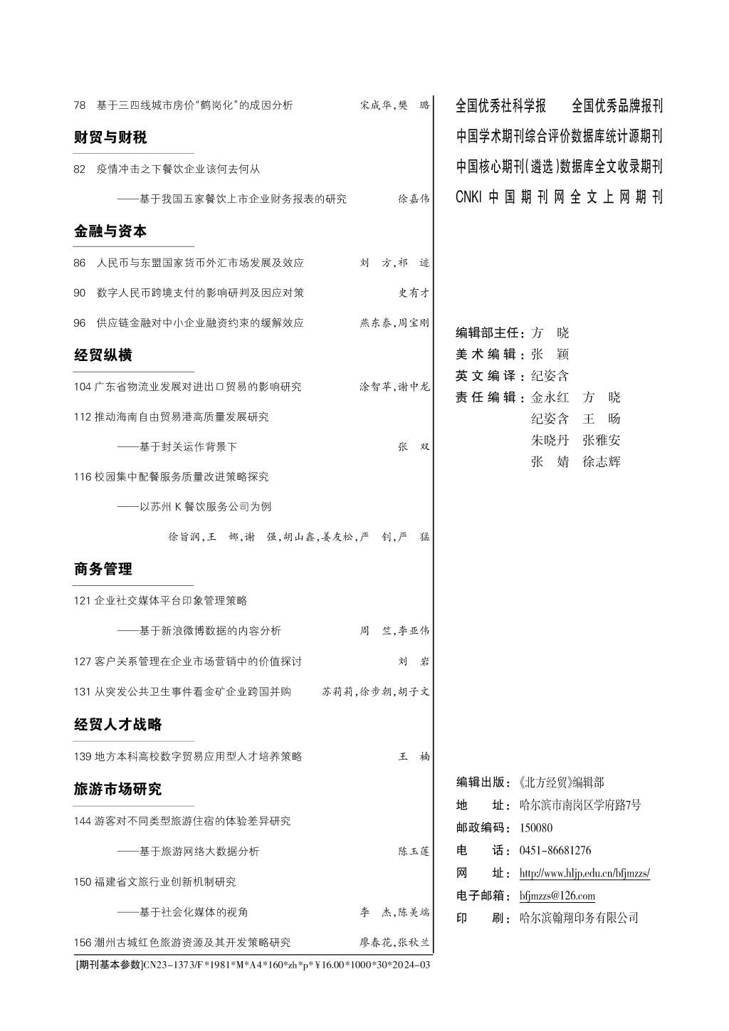 版权所有:北方经贸杂志社 地址:黑龙江省哈尔滨市南岗区学府路5号 邮编150080 电话:0451-86681276 86646778 邮箱:bfjmzzs@126.com