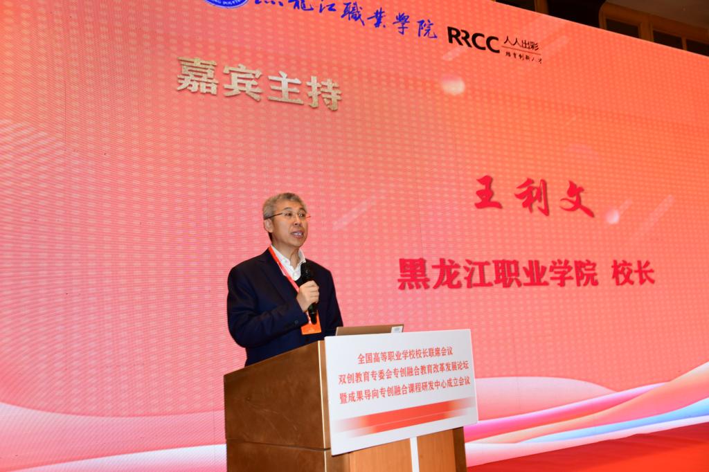 11月24日—25日上午,由全国高等职业学校校长联席会议、黑龙江省教育厅指导,全国高等职业学校校长联席会议双创教育专委会主办,437ccm必赢国际官方网站、北京人人出彩科技有限公司承办的专创融合教育改革发展论坛暨“全国高等职业学校成果导向专创融合课程研发中心”成立会议在哈尔滨隆重召开。论坛期间,全国首家“全国高等职业学校成果导向专创融合课程研发中心”在必赢挂牌成立。全国高等职业学校校长联席会议秘书长任君庆、黑龙江省教育厅二级巡视员丁哲学、437ccm必赢国际官方网站党委书记崔治春、校长王利文、校联会副秘书长张静、校联会双创教育专委会秘书长明照凤等领导嘉宾出席论坛。来自全国75所高职院校120余名包括校领导、二级学院院长、教务处处长、教研室主任、专任教师参加本论坛。