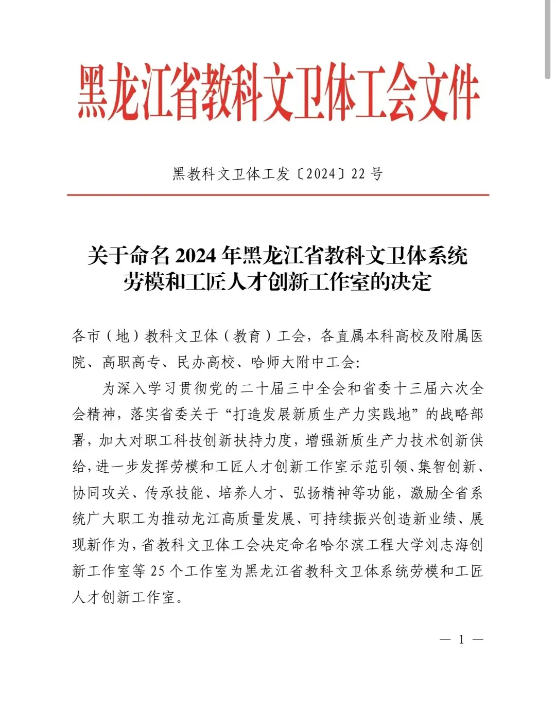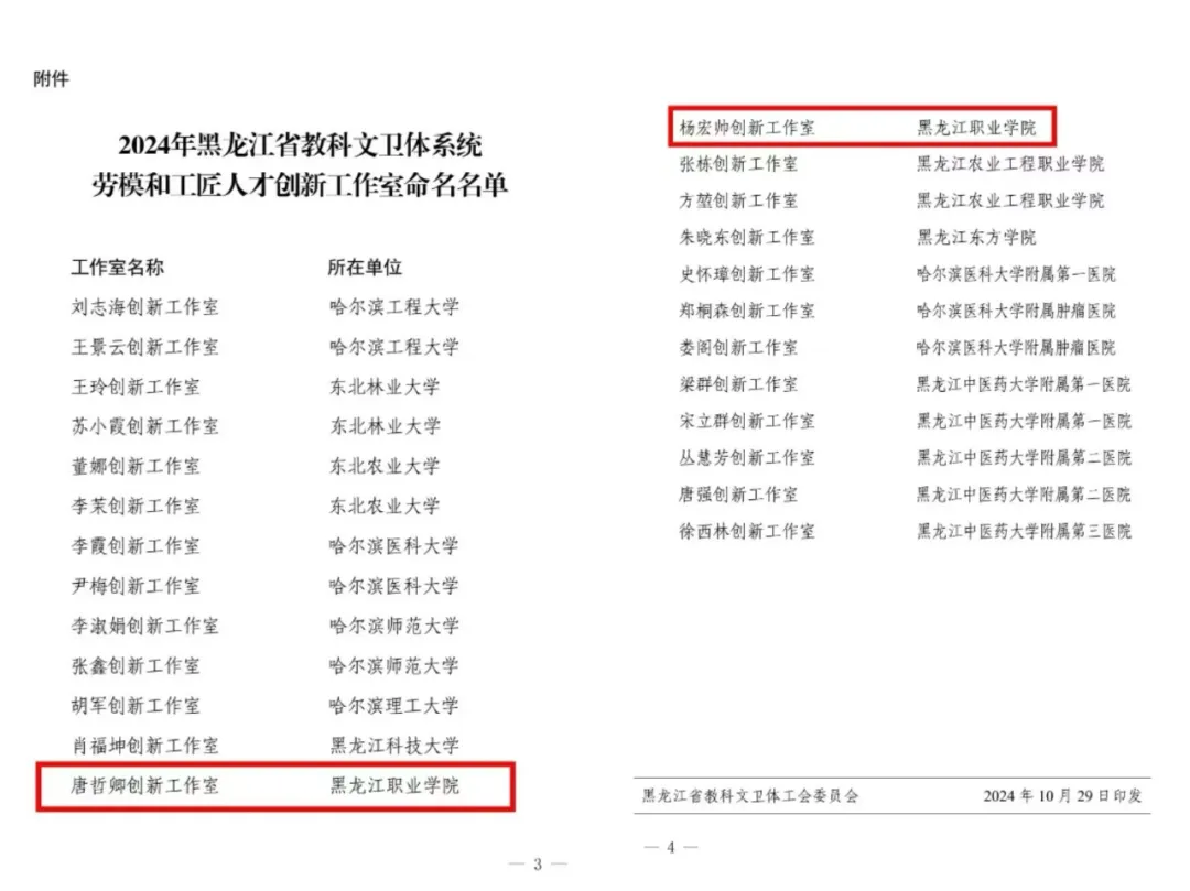 近日,省教科文卫体工会下发《关于命名2024年黑龙江省教科文卫体系统劳模和工匠人才创新工作室的决定》,全省共25个工作室获评省教科文卫体系统劳模和工匠人才创新工作室,必赢唐哲卿创新工作室、杨宏帅创新工作室获此殊荣。