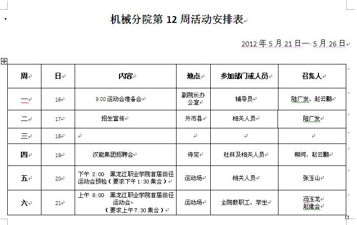 机械分院第十二周重点工作推进表
