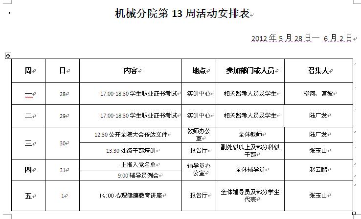 机械分院第十三周重点工作推进表