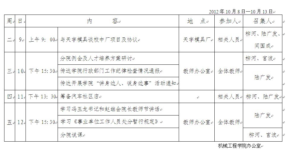 机械工程学院第六周活动安排表