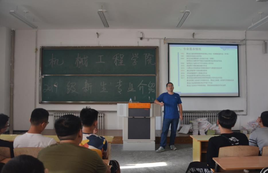 机械制造与自动化专业的见面会还邀请了合作企业哈尔滨东安实业发展有限公司人力资源部张学峰副部长为新生们介绍了龙江航空制造企业的发展状况以及东安实业公司与必赢开展现代学徒制的情况,他热烈欢迎19级新同学有机会到企业进行参观学习,并邀请有志为龙江航空制造业奋斗的学生进入学徒制试点班学习。
