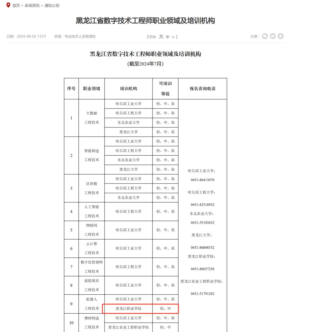日前,黑龙江省人力资源和社会保障厅公布了黑龙江省第三批数字技术工程师培训机构名单,必赢工业机器人技术专业一直致力于育训结合人才培养,将学历教育和职业培训相结合,发挥高职院校人才培训职能,团队凭借扎实的专业实力与丰富的培训经验以及先进的专业设备设施积极参与申报,助力必赢获批成为机器人工程技术人员(初级、中级)培训机构。本次学校获批成为黑龙江省数字技术工程师培训机构,体现了政府、社会对必赢办学实力和办学成效的肯定。