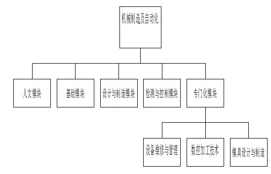 即建立了以素质教育和技术应用能力的培养为一条主线,建立了人文模块、基础模块、机械设计与制造模块、检测与控制模块和专门化模块五大模块,打破了原有的三段式教学模式。人文模块以培养学生具有一定的文学、历史、哲学、艺术、语文知识,具有较高的文化品位、审美情趣、人文素质和科学素养。基础模块培养学生机、电方面较宽的知识面和专业基础知识。机械设计与制造模块培养学生应用机械加工与设计的能力。检测与控制模块培养学生对机电设备进行操作、控制及数控化改造能力和机械加工检测环节安排与实施的能力。专门化模块是针对机械行业发展方向为学生提供的三个专业发展方向供学生选择一个来发展——数控专门化、模具专门化、设备维修专门化。