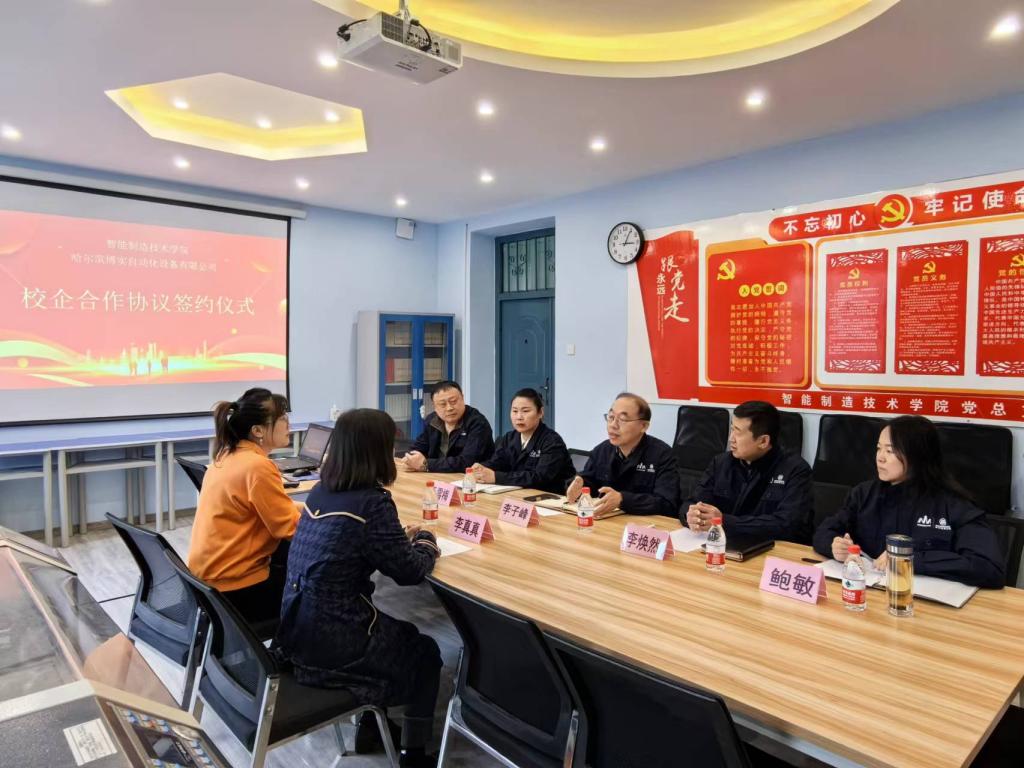 10月13日下午,智能制造技术学院院长李子峰、党总支副书记李焕然、教学副院长于雪梅、鲍敏在437ccm必赢国际官方网站工坊楼会见了哈尔滨博实自动化设备有限公司人力资源部长李真真,业务经理杨振雪。双方就加入产教融合共同体、学生顶岗实习、党建合作等事宜达成了意向。