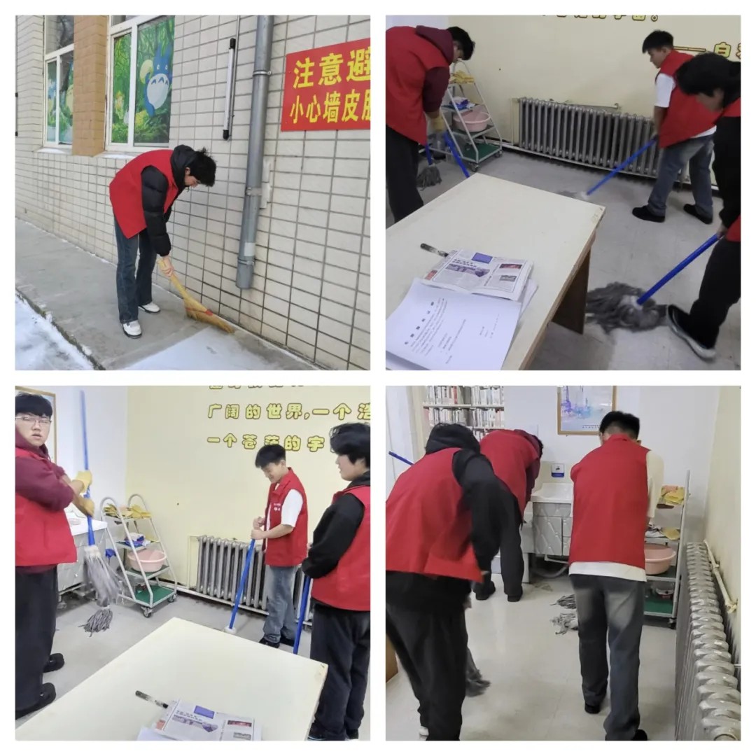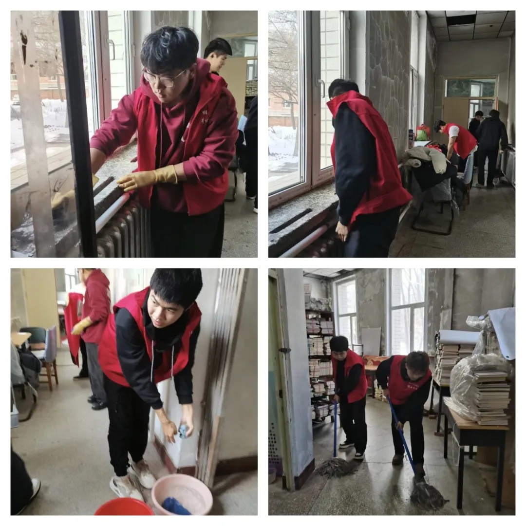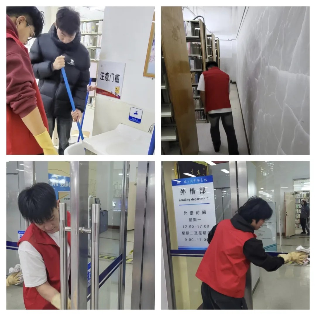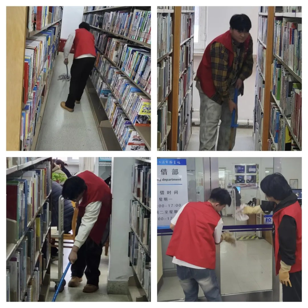志愿服务期间,在管理员的带领下,志愿者们迅速投入到各自的岗位中,他们擦拭门窗、暖气管道与窗台,并仔细对地面进行清扫,清理书架、整理图书。清理过程中,志愿者们展现出了高度的责任感和团队合作精神。他们认真细致地完成每一项任务,不仅为读者提供了便利,也为图书馆营造了一个更加舒适、整洁的阅读环境。