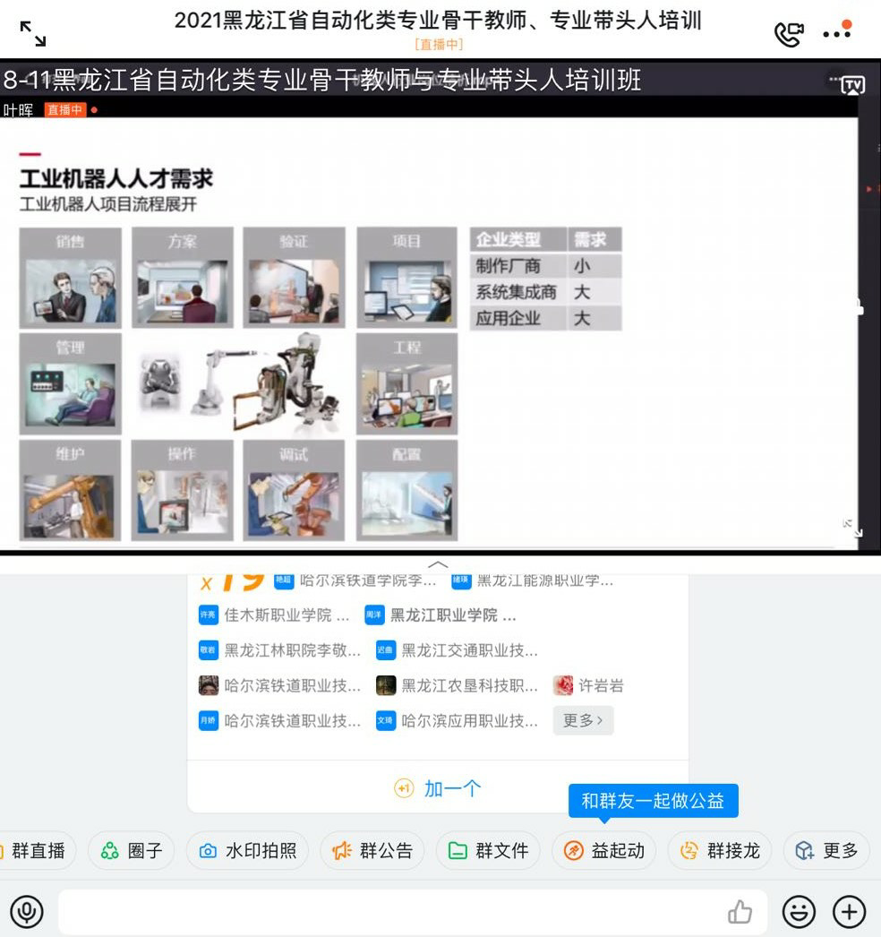 2021年8月11日至2021年8月21日,电气工程学院按照学校要求选派机电一体化技术专业专业带头人及教师参加黑龙江省2021年职业院校教师素质提高计划培训班,此次培训分为线上部分和线下部分。线上培训学习部分培训时间紧凑,培训内容丰满。培训主要从坚守教师职业行为准则潜心教书育人、高水平专业群建设与思考、工业机器人应用编程及应用仿真、职业院校教师如何做科研、国家级精品在线开放课程建设与思考、如何将课程思政融入工科教学等方面内容进行培训。通过本次黑龙江省职业院校教师素质提高计划培训班线上培训部分的学习,参培教师受益良多,特别是对教育教学理论有了更为深刻的理解和认识,教师素质得到提升。
