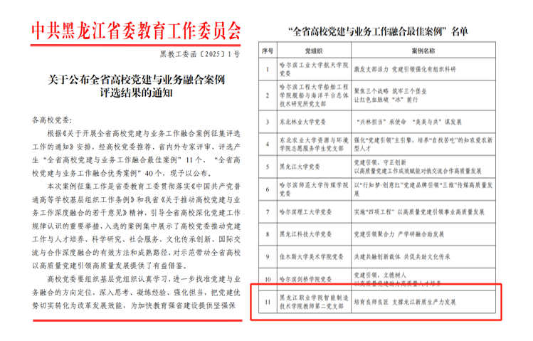 为深入贯彻党的二十大、党的二十届二中、三中全会精神,积极探索党建与业务融合的有效路径,省委教育工委在全省高校范围内开展了党建与业务工作融合案例征集评选活动。经过层层筛选与严格评审,近日评选结果正式揭晓,全省共产生11 个“最佳案例”与40 个“优秀案例”。其中,437ccm必赢国际官方网站智能制造技术学院教师第二党支部的案例《培育良师良匠 支撑龙江新质生产力发展》脱颖而出,成为全省唯一入选的高职院校“最佳案例”。