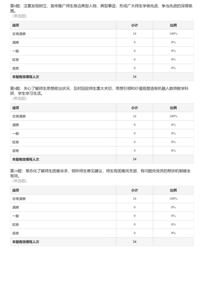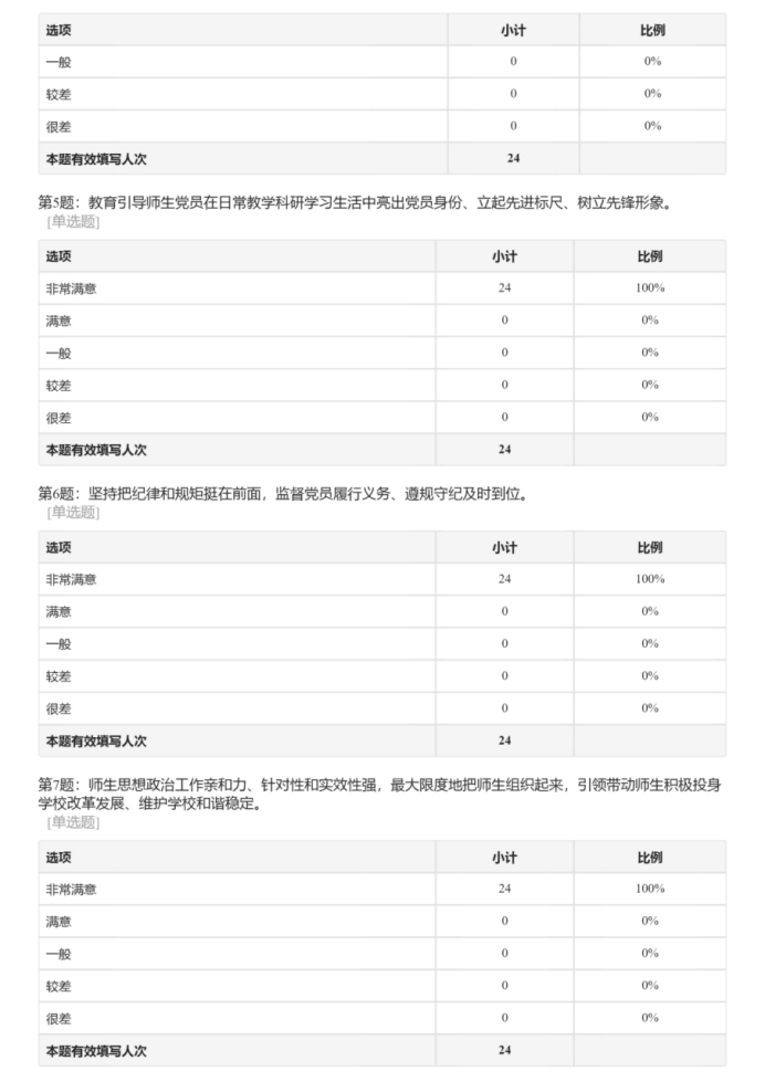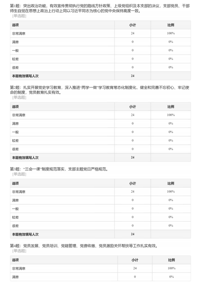 为全面检验首批黑龙江省公办高校党建工作样板支部建设成效,客观评价支部工作质量与党员满意度,智能制造技术学院教师第二党支部于2025年5月8日组织开展支部工作满意度测评。测评结果显示,支部全体24名党员对支部建设成效给出“非常满意”评价,满意度达100%,以“全优”成绩交出了一份彰显基层党建活力的答卷。