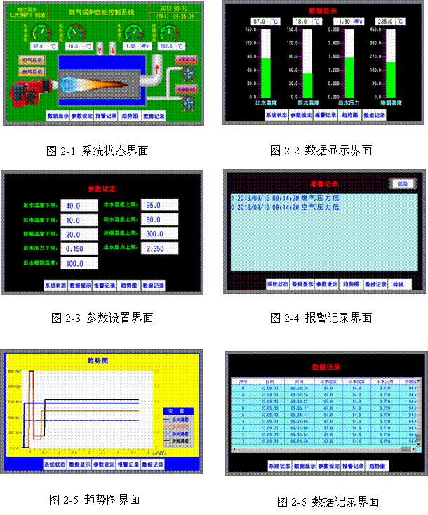 该系统工作界面包括系统状态、数据显示、参数设定、报警记录、趋势图和数据记录六个页面,操作员可以通过人机界面进行参数设置和查看系统运行数据,从而监控锅炉的运行状态。界面设计如图所示: