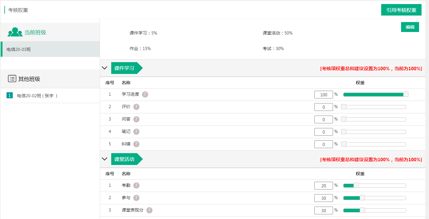 1.根据课程大纲,设置课程中各种教学环节在综合成绩中的权重,让所有的教学环节对成绩都有贡献;