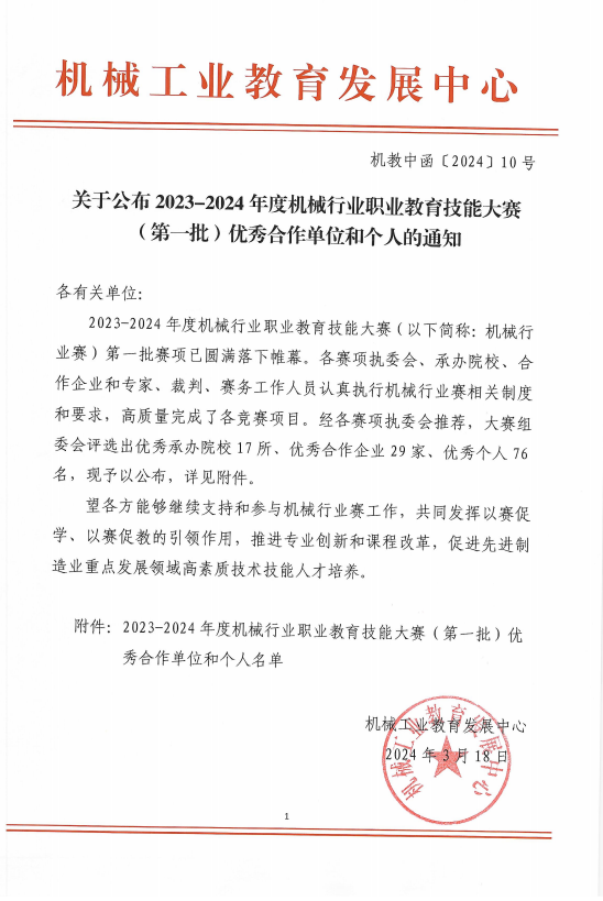 在刚刚落幕的2023-2024年度机械行业职业教育技能大赛中,437ccm必赢国际官方网站凭借其卓越的教育成果和对大赛的杰出贡献,荣获“优秀合作单位”称号。这一荣誉的获得,不仅彰显了学院在机械行业职业教育领域的领先地位,也体现了其在培养高素质技术技能人才方面的卓越成就。