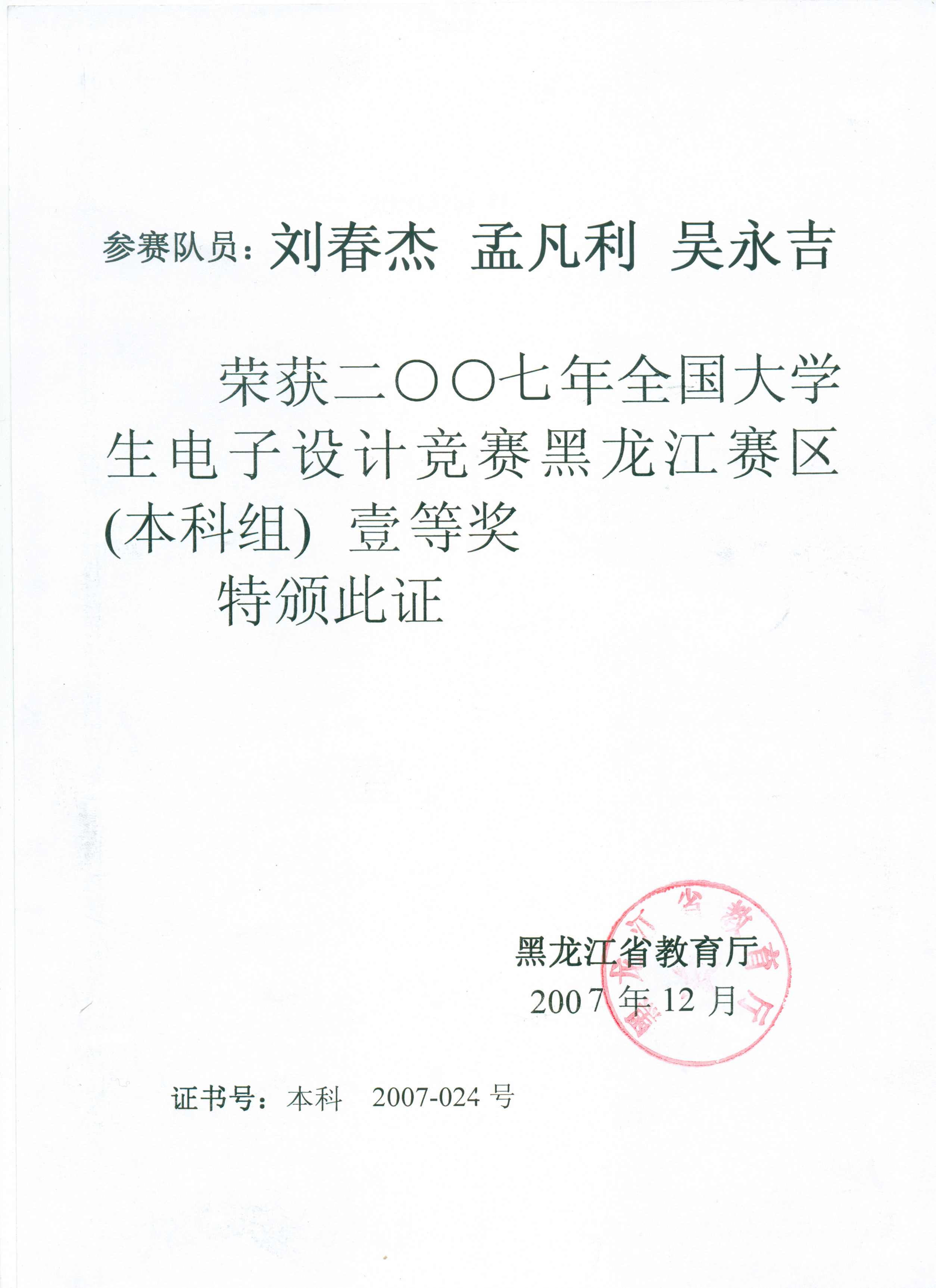 2、吴永吉、李财、李广杰同学荣获二零零六年黑龙江大学生电子设计竞赛(高职高专组)贰等奖。