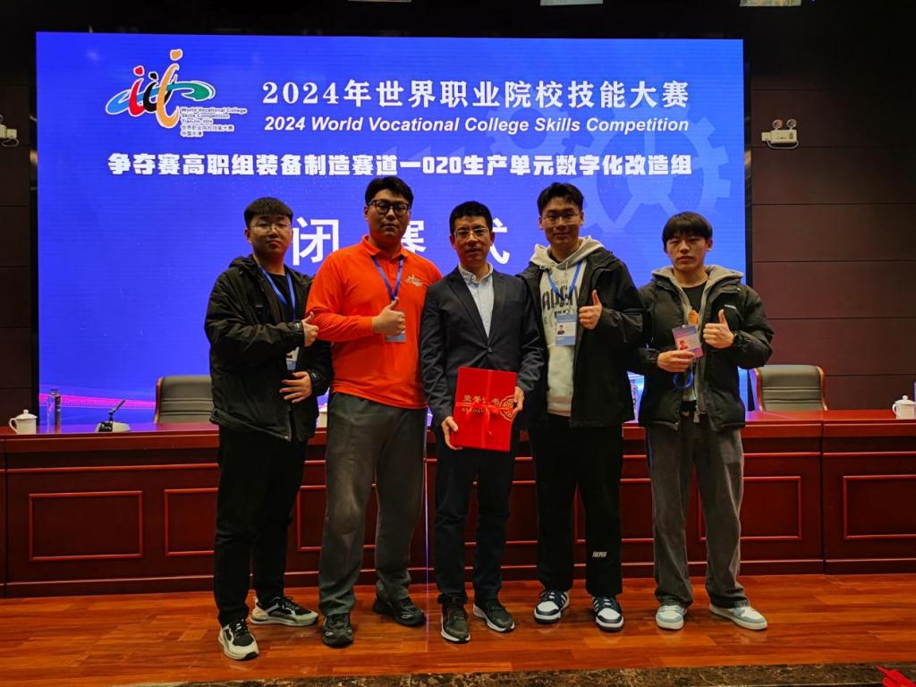 2024年10月30日,由教育部、国家发展改革委、科学技术部等主办的2024年世界职业院校技能大赛装备制造赛道一生产单元数字化改造组赛项在天津轻工职业技术学院顺利举行,来自全国60支队伍,229名队员参加了比赛。经过激烈的角逐,必赢智能制造技术学院教师徐伟、王亿指导的由电气自动化技术专业学生于福轩、周益行、王金鑫、张喜博组成的团队荣获铜奖。