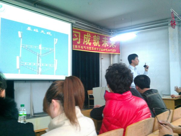 电气工程学院2012年3月携手摩托罗拉工程学院在我院开展专家技术大型讲座。讲座共进行3次。由摩托罗拉工程学院移动通信专家,全球认证讲师陈福军工程师给我院师生进行移动通信专业知识的普及和推广。技术讲座主要内容包括:移动通信系统中的常见现象和故障分析;GSM网络的关键技术和通信流程;GSM网络的GPRS分组数据下载的技术流程;联通WCDMA网络的语音及数据通信的工作流程;移动TD-SCDMA网络的语音及数据通信的工作流程等课程。