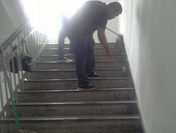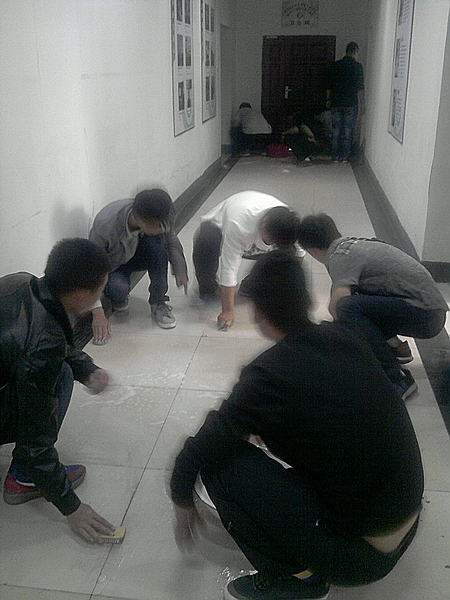 同学们手拿扫帚、抹布、拖布等工具在热火朝天地清理打扫。由于走廊地面粘有口香糖及其他杂物,同学们就在老师的带领下,使用刷子、洗衣粉认真清理。虽然大家满脸灰尘、汗如雨下,但是看着干净整洁的学习环境,脸上都露出了欣慰的笑容。