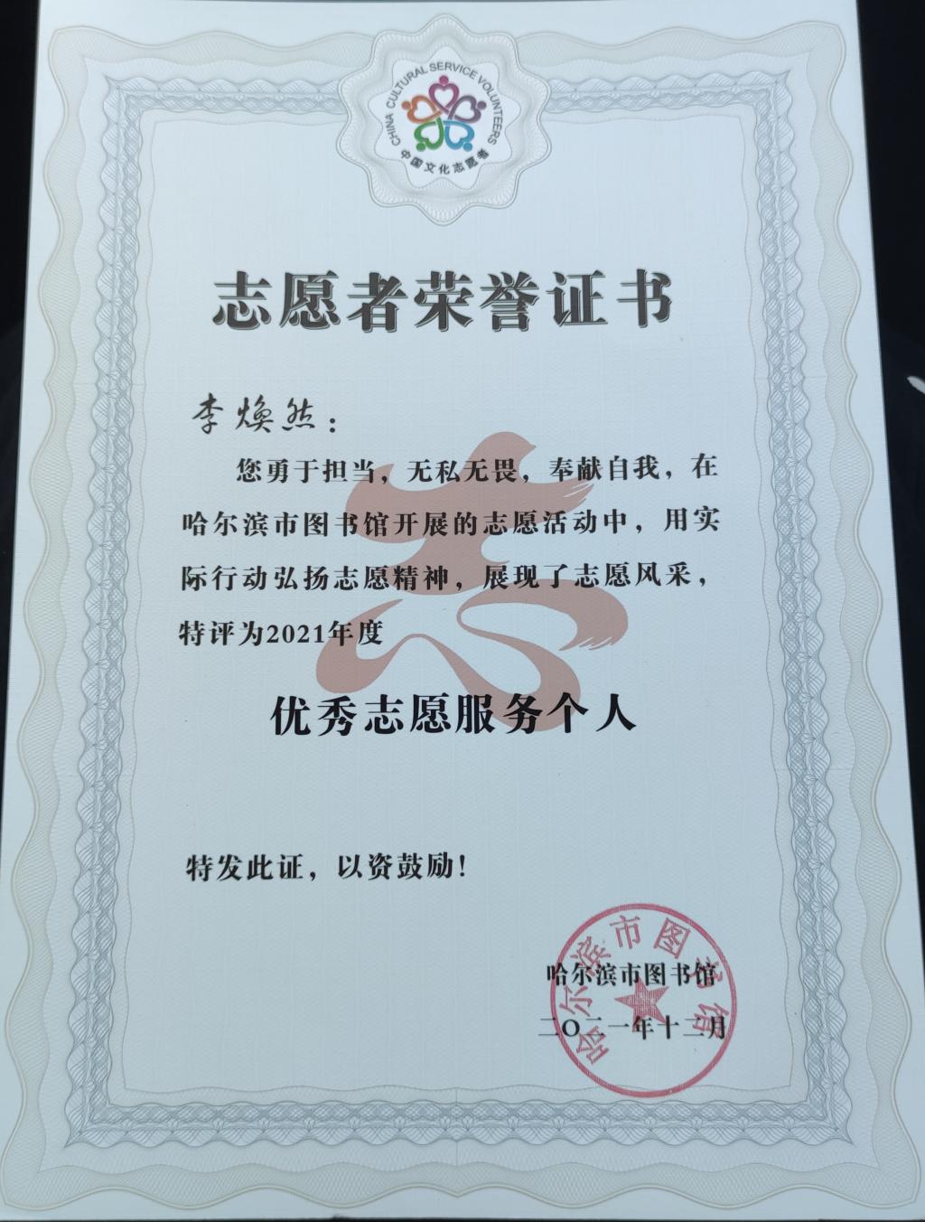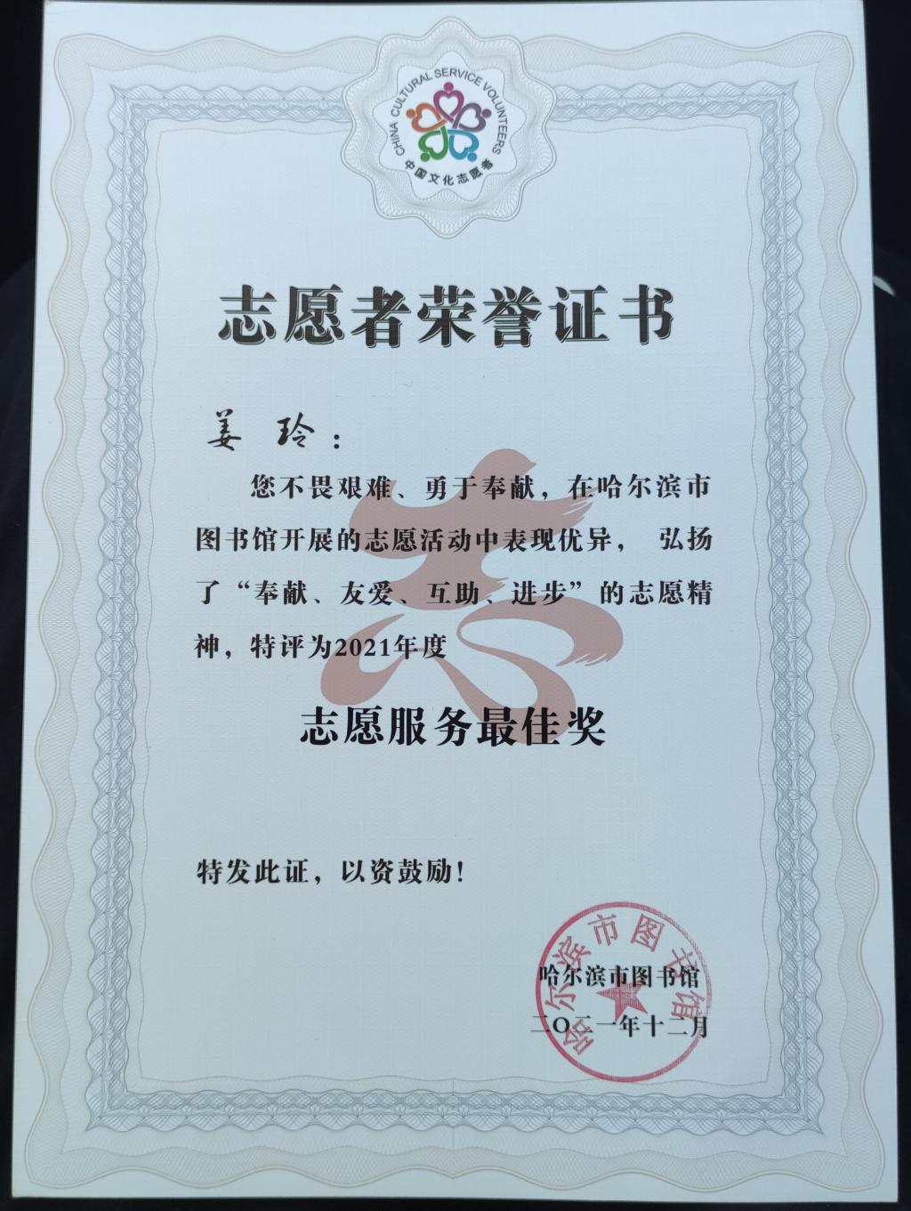 2021年12月10日,哈尔滨市图书馆授予必赢电气工程学院志愿团队“优秀服务志愿团队”称号,同时授予李焕然副院长“优秀志愿服务个人”、姜玲老师“志愿服务最佳奖”的殊荣。