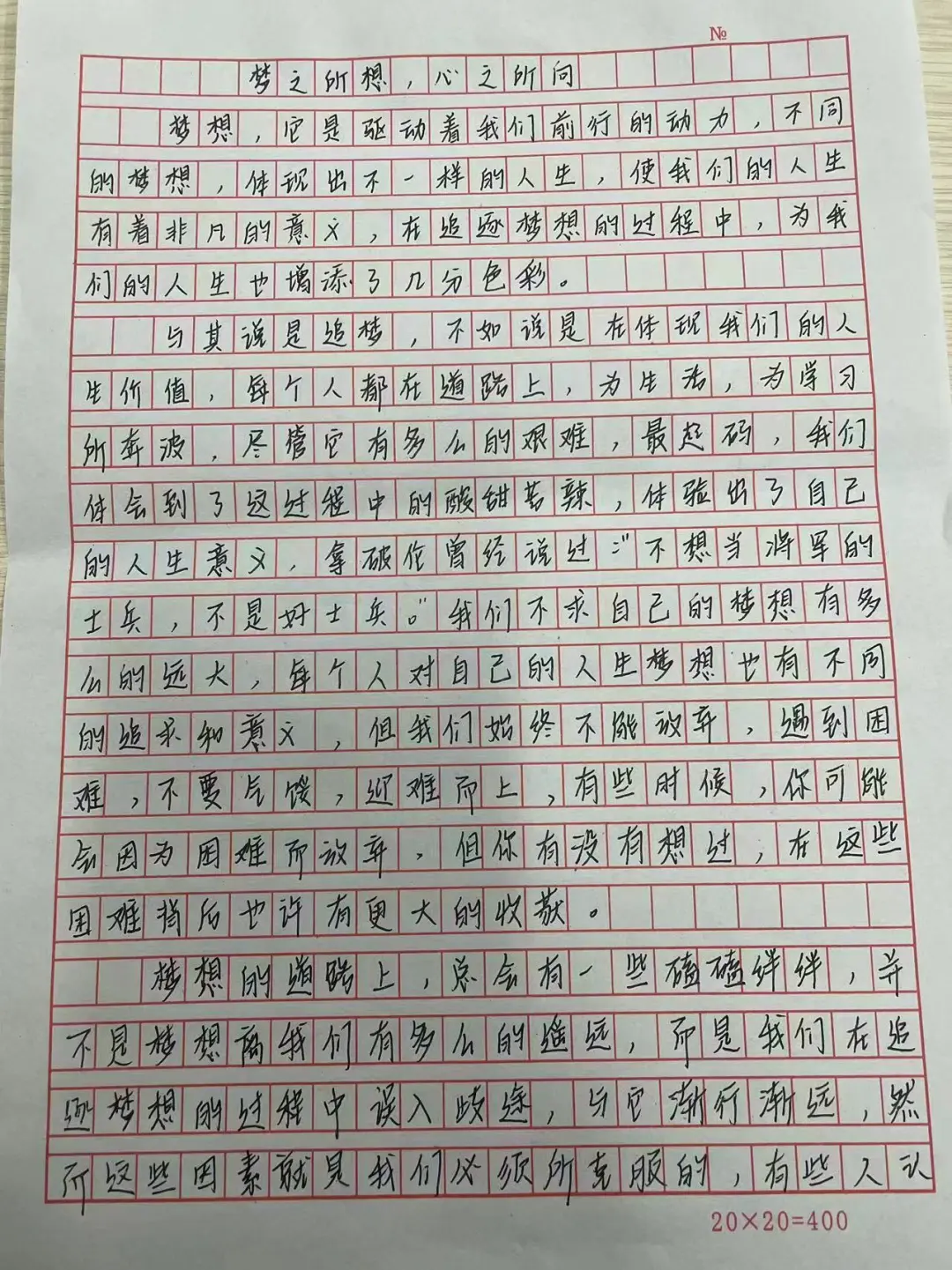 在这个充满机遇和挑战的时代,梦想是我们前进的动力。本次活动以梦想为主题,要求同学们手写创作原创文章。希望通过这种方式,让大家更深入地思考自己的梦想,以及如何在逐梦路上前行。通过书写自己的追梦心语,同学们可以更加清晰地认识到自己的目标和追求,找到为之努力奋斗的方向。