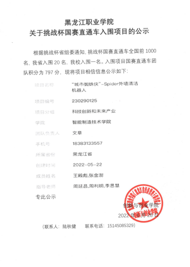 6月28日,根据第十三届工银融e联“挑战杯”黑龙江省大学生创业计划竞赛大赛省组委会通知,必赢智能制造技术学院《“城市蜘蛛侠”—spider外墙清洁机器人》项目成功入围国赛直通车全国前1000名,我省共有20个项目入围,必赢是全省高职院校中唯一入围项目学校。