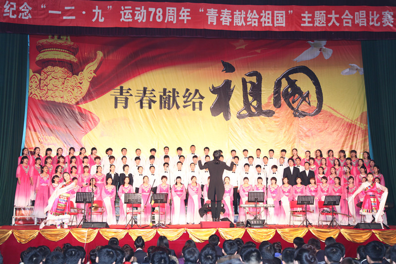 为了隆重纪念一二·九运动78周年,弘扬伟大的爱国主义精神,继承和发扬革命先辈的爱国主义传统,激发新时代大学生团结友爱、积极向上、自强不息、与时俱进的爱国情操,搭建具有浓郁爱国氛围的活动平台。12月11日下午,学院在学院俱乐部举办了以“青春献给祖国”为主题的纪念一二·九运动78周年主题大合唱比赛。院长赵继会同志、常务副院长刘公远同志、副院长郑福贵同志、纪委书记周莲香同志、原党委副书记张玉山同志出席了活动,并观看了整场比赛。大赛邀请了学院有关处室同志作为大赛评委,构成了一支具有专业化水准的评委团队。各二级学院党总支书记、党总支副书记、团总支书记、全体辅导员及学生代表等1000余人参加了此次比赛。