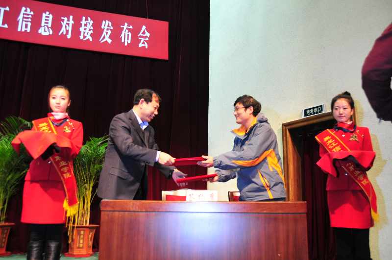 10月27日上午9时,由省工业和信息化委员会、省教育厅、省人力资源和社会保障厅主办,我院和信息技术职业学院承办的2010年全省院校学生就业与企业用工信息对接发布会在哈尔滨和平邨和平会堂胜利召开。全省28所本科院校、24所高职院校、51所技工学校及100多家知名企业参加了会议并发布供求信息。我院院长赵继会同志在主席台就坐,并分别与哈尔滨电机厂、牡丹江恒丰纸业有限责任公司现场签订了校企合作协议,学院党委副书记张玉山同志代表学院作了2011届毕业生信息发布。