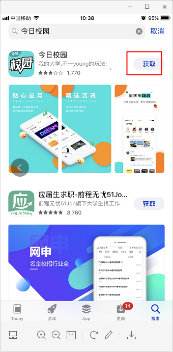 l 苹果手机登陆APPSTORE搜索“今日校园”下载安装;