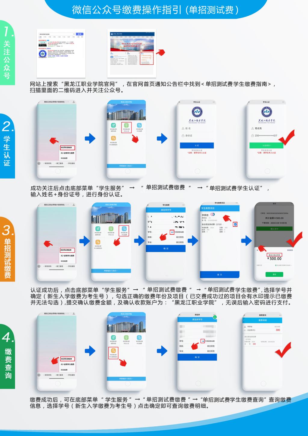 以上流程可参考后附的“微信公众号缴费操作指引(单招测试费)”图例。