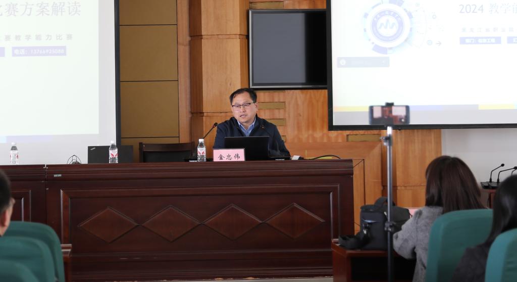 会上,信息工程学院党总支书记、教育部职业院校教学(教育)指导委员会、黑龙江信息化教学(教育)指导委员会秘书长金忠伟从大赛介绍、比赛方案分析、参赛材料的准备等几个层面全面解读了2024年黑龙江省职业院校技能大赛教学能力比赛方案的新要求、新标准。2022年全国职业院校技能大赛教学能力比赛一等奖团队负责人鲍敏、2023年全国职业院校技能大赛教学能力比赛一等奖团队负责人李晓松分别从选课与组队、教学实施报告撰写、课堂教学视频录制、参赛文档材料规范、答辩技巧、备赛建议等方面进行了参赛经验的分享。