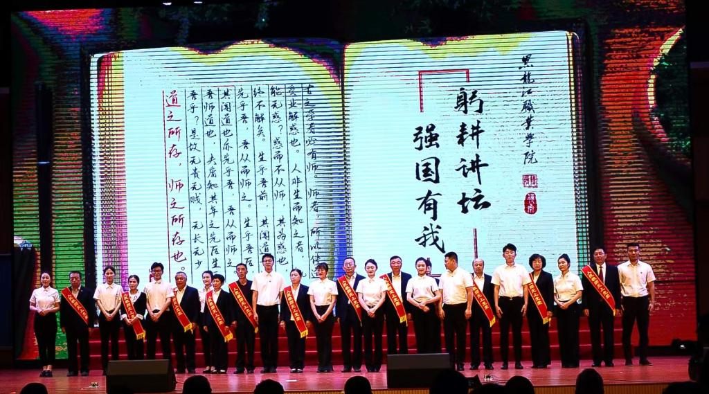 新教师上台,在党委委员、宣传统战部(教师工作部)部长杨东辉带领下,宣誓《龙职教师誓词》。
