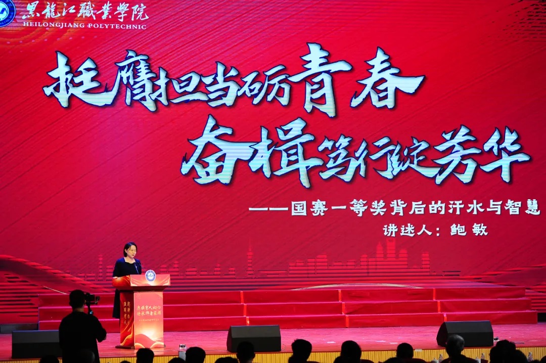 在“讲好龙职故事,讲龙职好故事”环节,宣讲人鲍敏、王迪、于德洋、王艳辉先后讲述了龙职人《挺膺担当砺青春 奋楫笃行绽芳华——国赛一等奖背后的智慧与汗水》《砥砺前行 用热爱和担当创造历史——招生就业工作实现双轨并进》《愿为一束光 做青春领路人——辅导员团队继往开来谱新篇》《三心”铸师魂 最美龙职人——记农牧工程学院教师郭宏军》的故事。