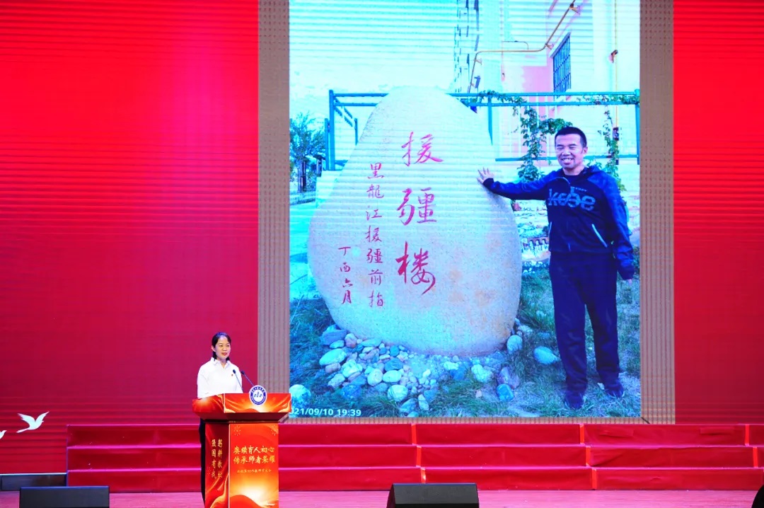 王义刚等几位老教师在台上与大家分享了自己从教多年的感悟和心里话。年轻教师为老教师献上“人民教师 无上光荣”的绶带,老教师为新教师佩戴校徽。这是一种传承,更是一种信仰,在这枚小小的校徽里蕴含着老教师对年轻教师的深情告白:躬耕教坛、强国有我。