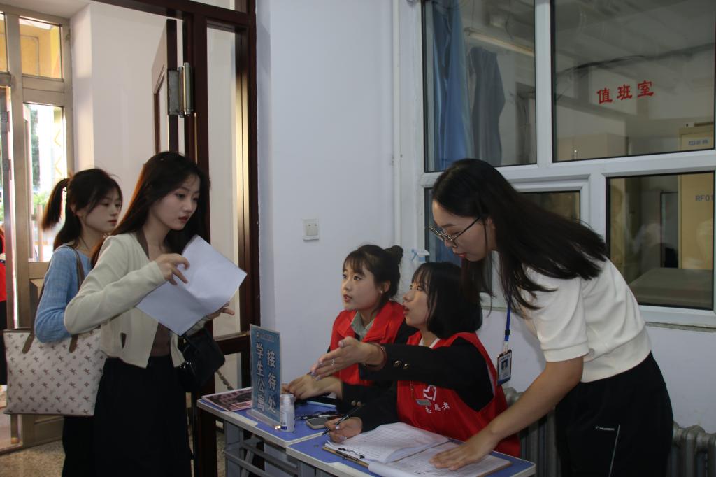 ▲公寓辅导员和学生志愿者为2023级新生办理入住