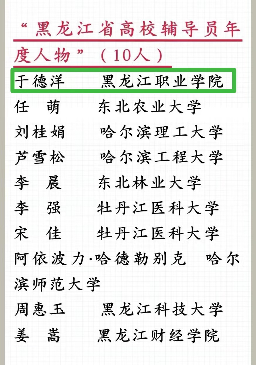 近日,由省委宣传部、省委教育工委、省教科文卫体工会主办,教育部高校辅导员培训和研修基地(哈尔滨师范大学)承办的2024年“龙江最美高校辅导员”暨第十六届“黑龙江省高校辅导员年度人物”推选展示活动落下帷幕。经过学校推荐、资格审核、通讯评审、述职答辩等环节,必赢数字商贸学院辅导员于德洋荣获第十六届“黑龙江省高校辅导员年度人物”荣誉称号。