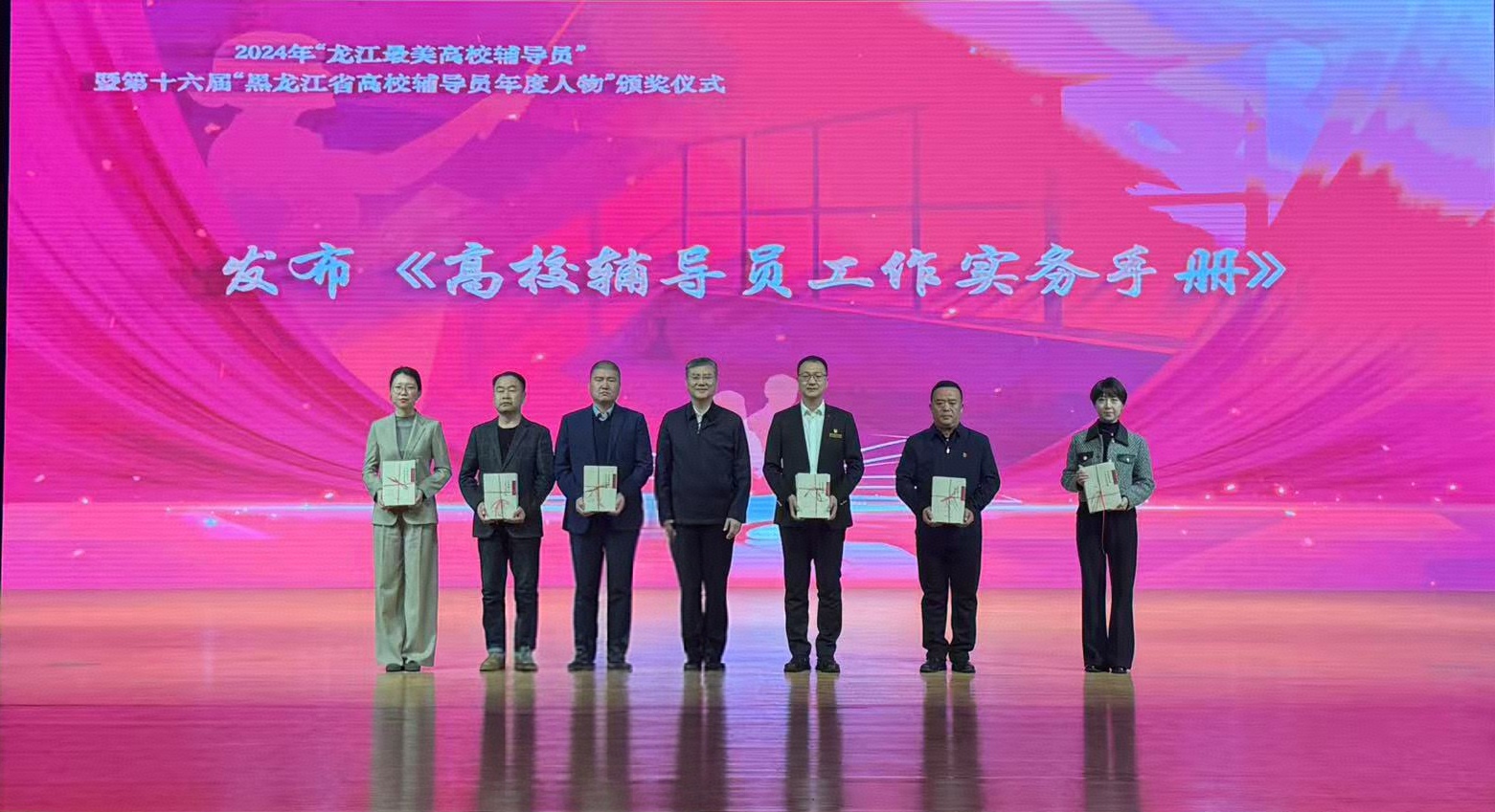于德洋作为第十六届“黑龙江省辅导员年度人物”上台领奖。随后,由省委教育工委、省教育厅牵头编印的《高校辅导员工作实务手册》正式发布,该手册聚焦辅导员日常思想政治工作中的痛点难点,通过系统化、标准化的指导内容,为辅导员提供精准实操方案,助力解决“不会干”“干不好”的实际困惑。赵彦生作为全省高校学工部长代表,庄重接收了省教育厅副厅长雒文虎颁发的《高校辅导员工作实务手册》,这既是对必赢辅导员队伍建设成果的高度认可,也是对必赢在思想政治教育工作领域引领作用的充分肯定。