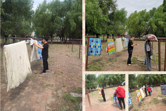 由于建造年限久远,男生2号公寓是这次行动的重点目标。大家对每一个寝室进行细致排查,现场指导保洁人员对个别有鼠蚁情况的寝室彻底消毒,清理卫生,做到无死角、无漏点。对几个返潮严重的一楼阴面寝室,大家动手给每床被褥“贴标签”,随后将被褥抱到室外晾衣场统一晾晒,并适时给被褥“翻个身”,“拍打拍打”被褥,使学生的被褥既能晾晒好、又去除灰尘,还能准确归回原位。