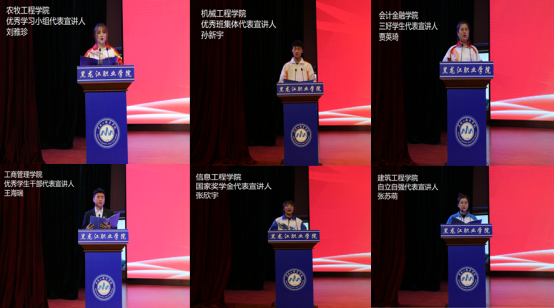首先,大会举行了庄严的奏唱国歌仪式。随后,王明海宣读表彰奖励文件,钟敏强宣读龙职助学工程实施方案,各位学校领导先后为优秀学习小组、优秀班集体、三好学生、优秀学生干部、奖学金获得者颁发奖牌和证书,为自励自强学生代表发放了返程车票,并现场由100名干部教师与100名受助学生结成“一帮一”对子,又有六名同学分别作为不同类型的先进典型代表发言。