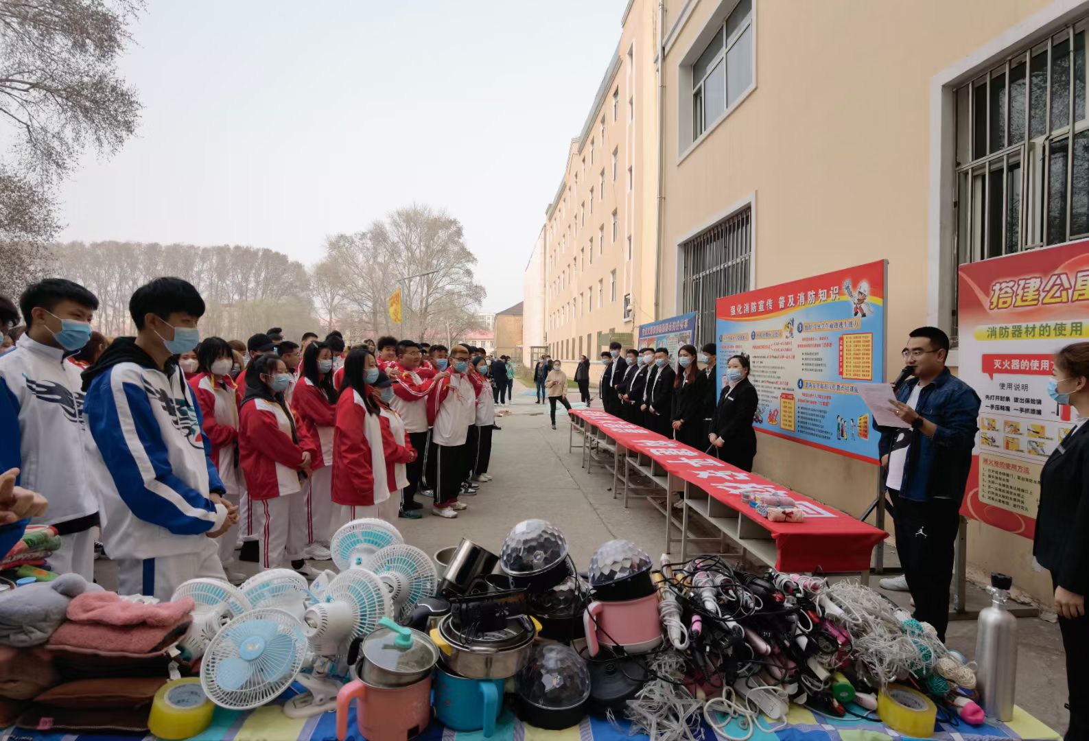 4月21日下午,在第二校区一号学生公寓楼前举行现场活动。活动现场进行了灭火器的讲解和实战演示、应急情况下开启公寓安全门疏散逃生、大功率电器及违禁品展示、有奖安全知识问答等活动。灵活多样的互动环节,吸引了大批学生踊跃参与,公寓中心准备了带有安全小常识的香皂、牙刷、水杯等生活用品相送。最后,师生们在“遏制火灾隐患,构建平安校园”条幅上集体签名留念。