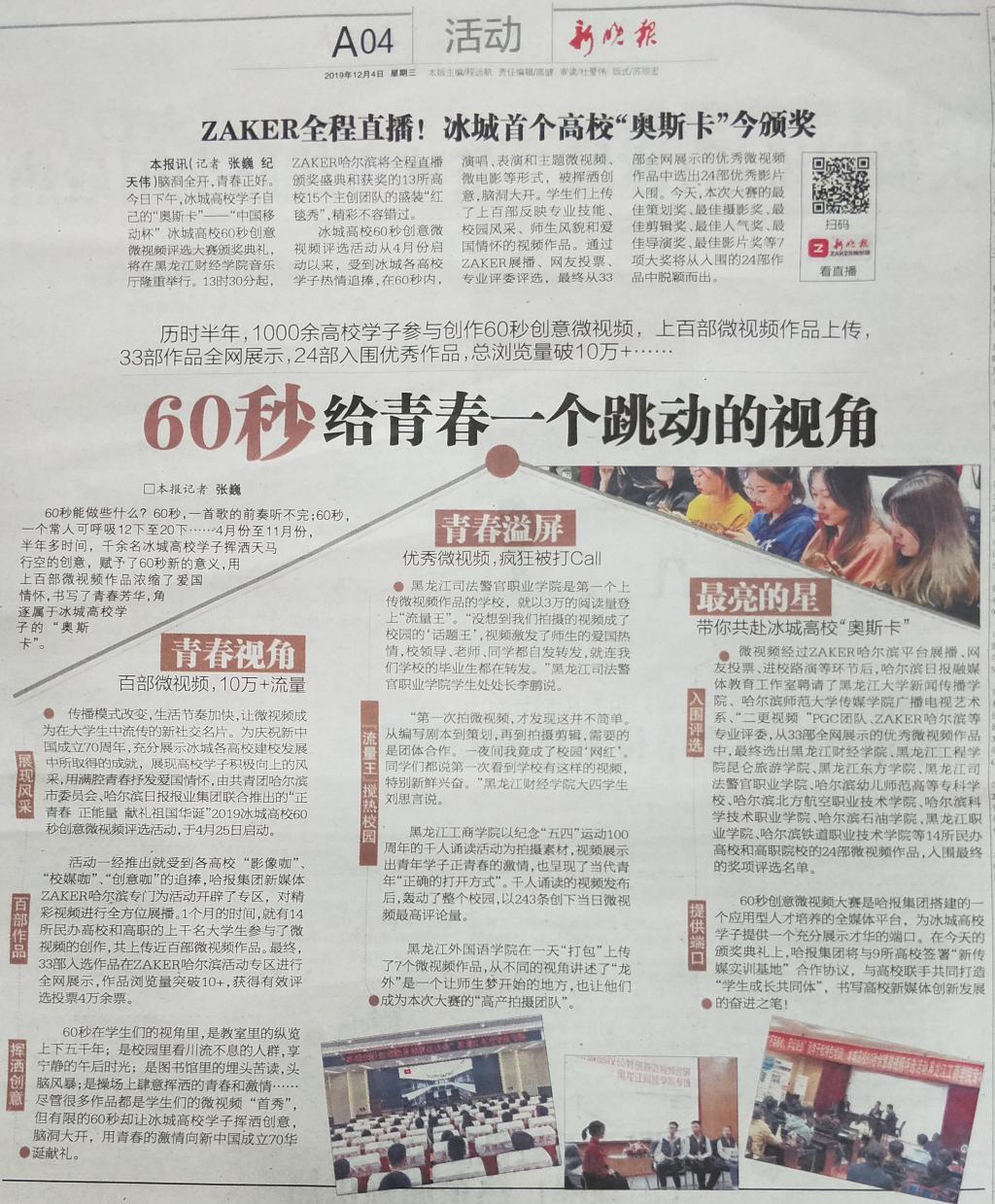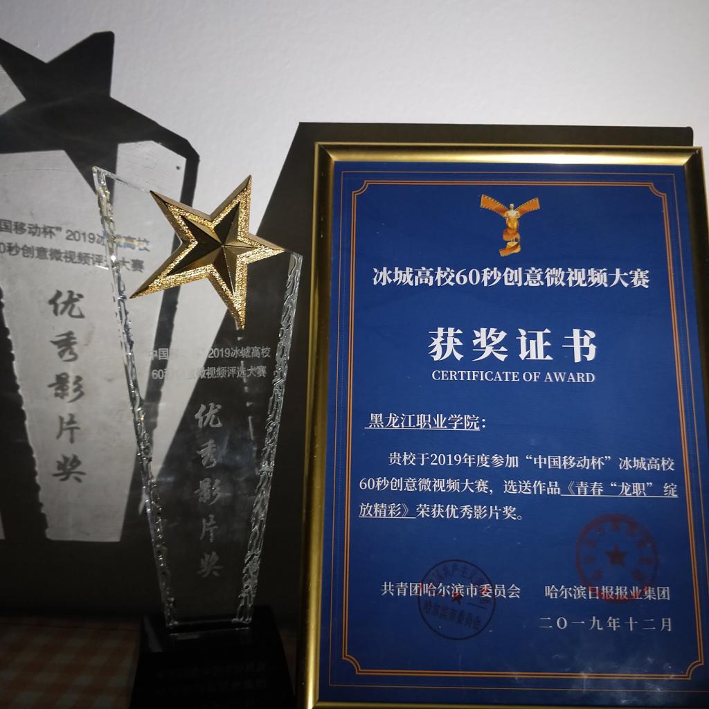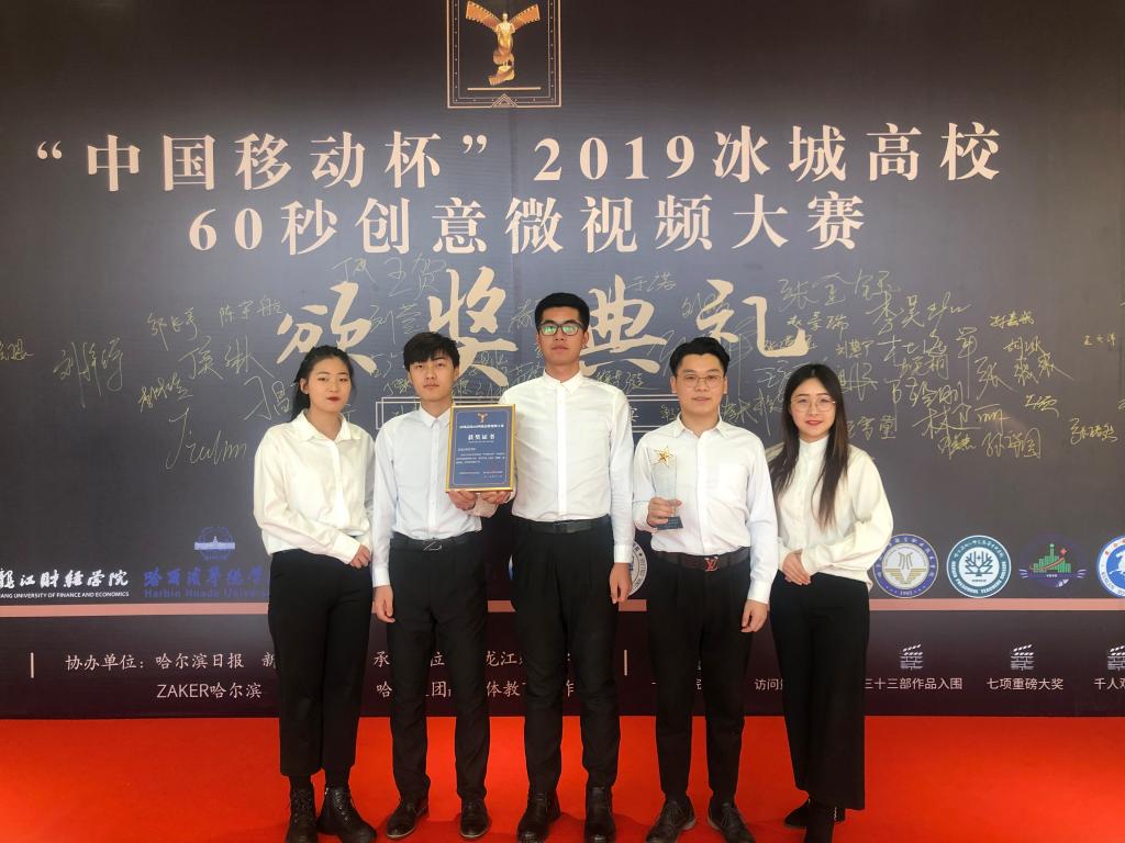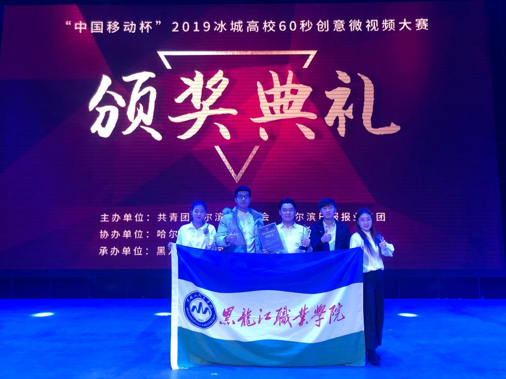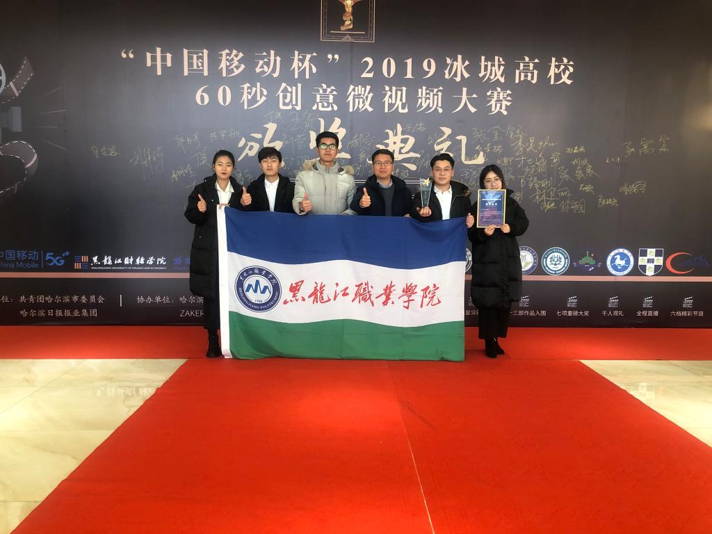 12月4日,“中国移动杯”2019冰城高校60秒创意微视频大赛颁奖典礼隆重举行。大赛由共青团哈尔滨市委员会、黑龙江日报报业集团共同主办,哈尔滨日报、新晚报、ZAKER哈尔滨共同协办,黑龙江财经学院、哈报集团融媒体教育工作室联合承办。由必赢大学生新媒体中心袁思强等同学创作的微视频作品《青春龙职,绽放精彩》荣获大赛“优秀影片奖”,必赢团委书记邹春雷率主创团队参加颁奖典礼活动。