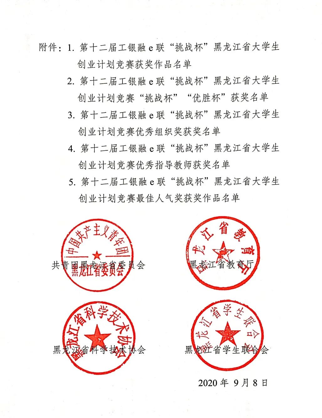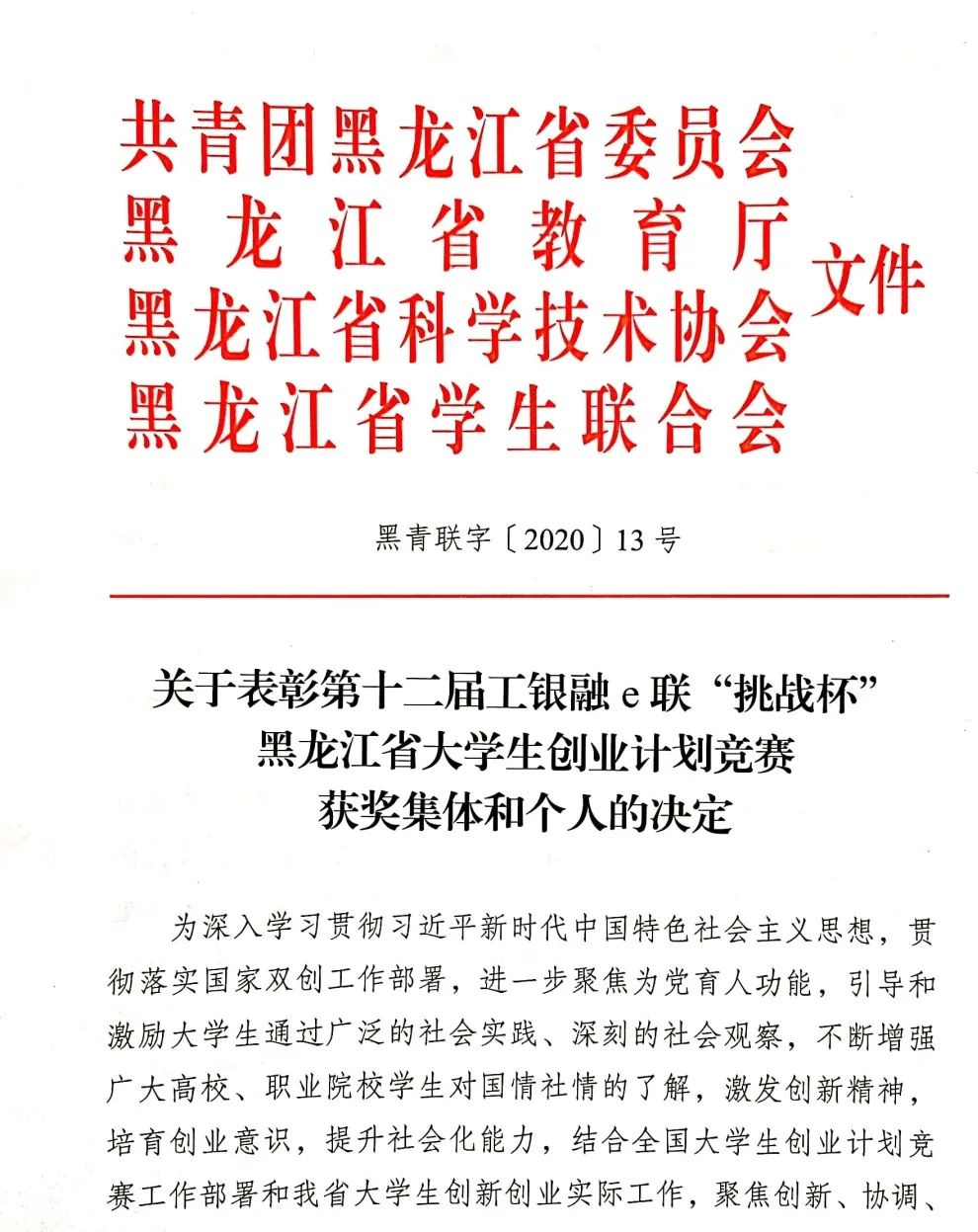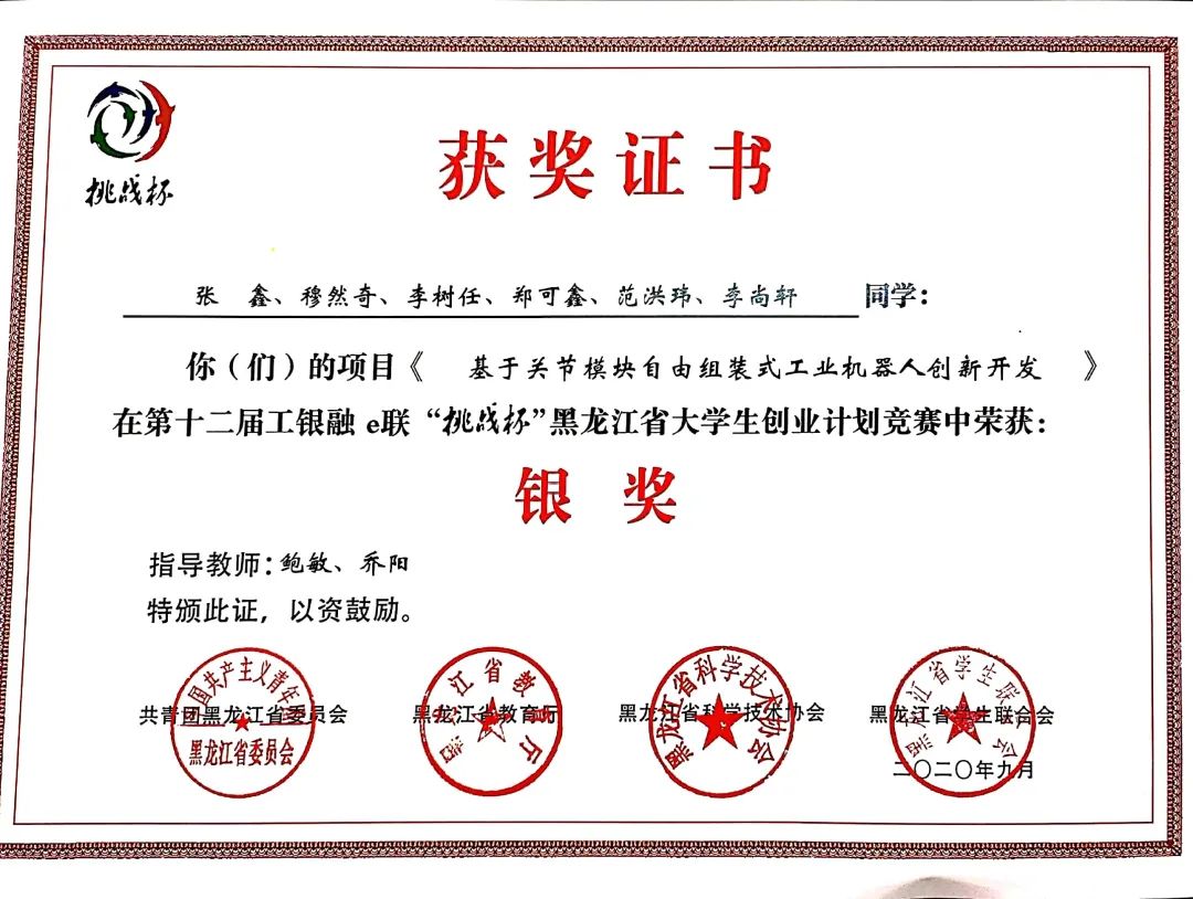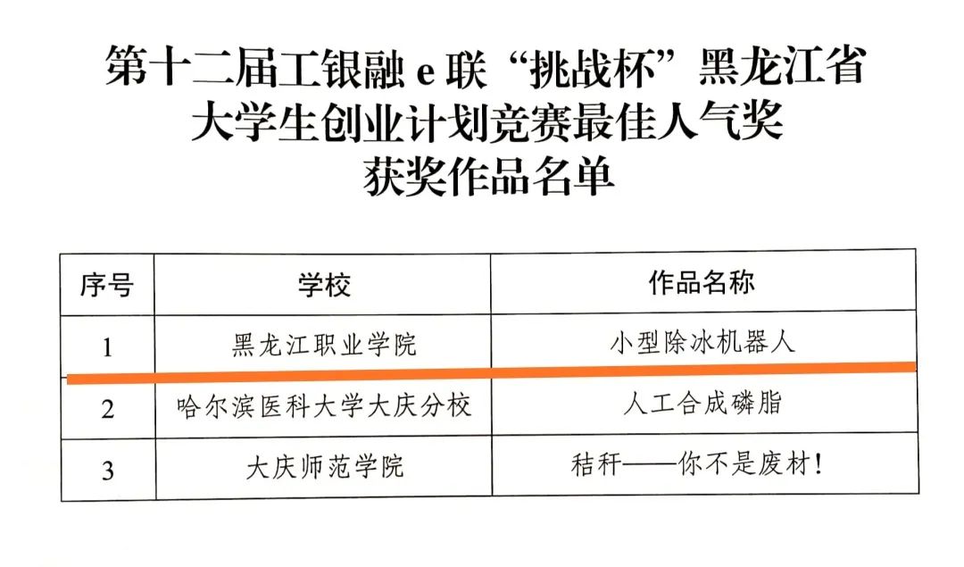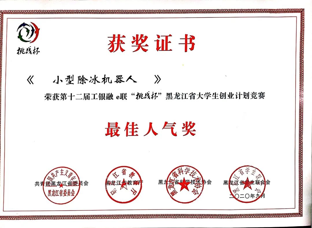9月8日,团省委、省教育厅、省科学技术协会、省学生联合会联合印发了《关于表彰第十二届工银融e联“挑战杯”黑龙江省大学生创业计划竞赛获奖集体和个人的决定》(黑青联字[2020]13号)文件,必赢参赛项目荣获大赛金奖四项、银奖二项、铜奖三项,有三项作品被推荐至国赛,由机械工程学院教师潘胤卓指导,学生肖童负责的《小型除冰机器人》项目以总票数排名第一的成绩荣获“最佳人气奖”,必赢荣膺大赛“优胜杯”,创造了必赢“挑战杯”参赛史最佳成绩。