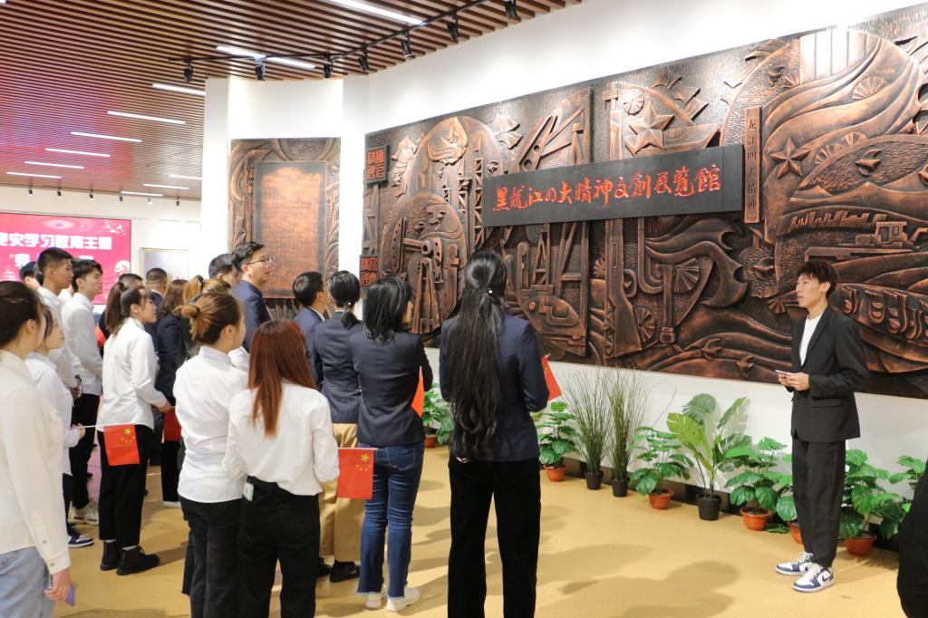 参观中,师生在展馆讲解员的带领下,参观了展览馆中一件件作品,一幅幅图画,唤醒了大家对红色文化的学习,深深地感受到了龙江儿女在党的领导下,高举旗帜、开拓进取、艰苦奋斗,坚定理想信念,形成了以“东北抗联精神”“北大荒精神”“大庆精神”“铁人精神”为代表的黑龙江优秀精神。