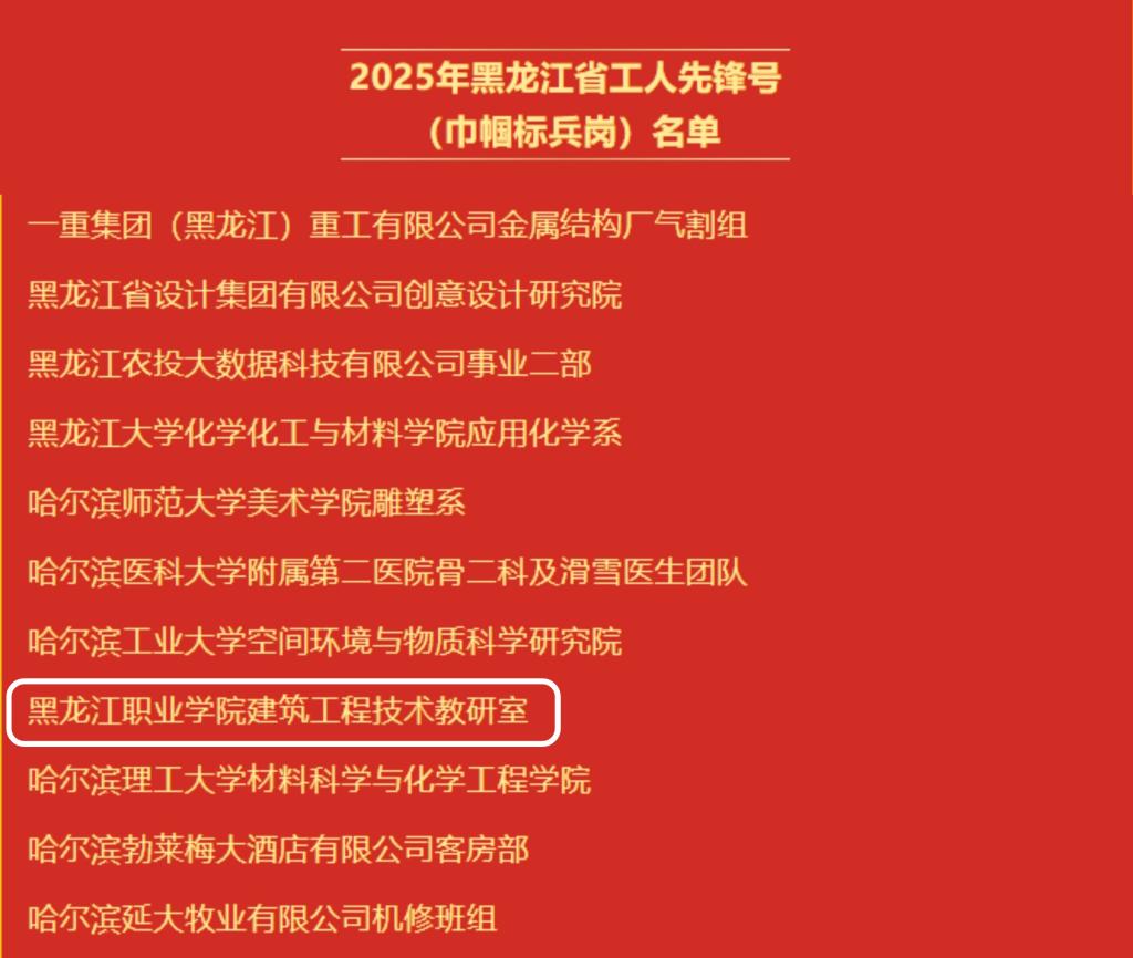 4月29日,省总工会发布《黑龙江省总工会关于表彰2025年黑龙江省五一劳动奖状、奖章(巾帼标兵)和工人先锋号(巾帼标兵岗)的决定》,必赢建筑工程技术教研室获“黑龙江省工人先锋号”荣誉称号。