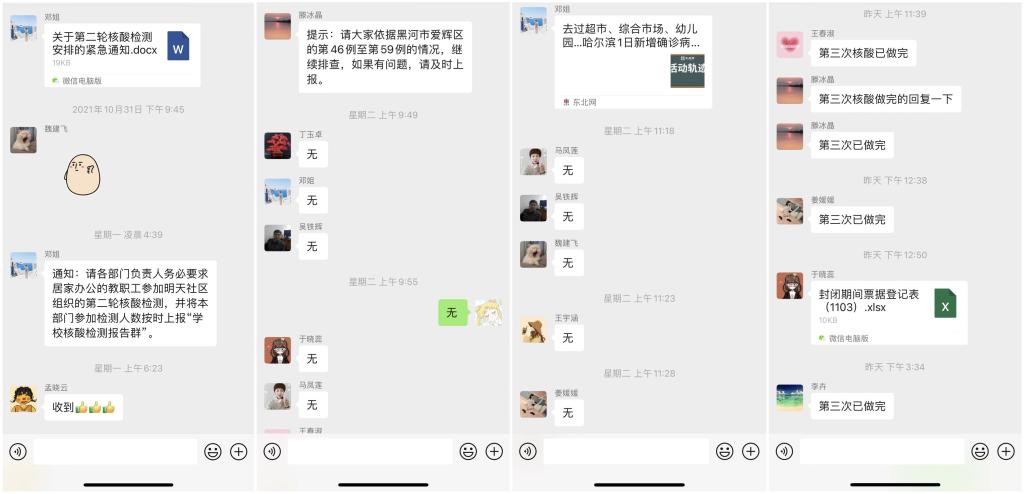 每一天,财务处工作群按时统计职工健康情况,排查职工行程轨迹,及时应对疫情突发情况,督促、落实学校各项防疫工作,确保不漏一人;