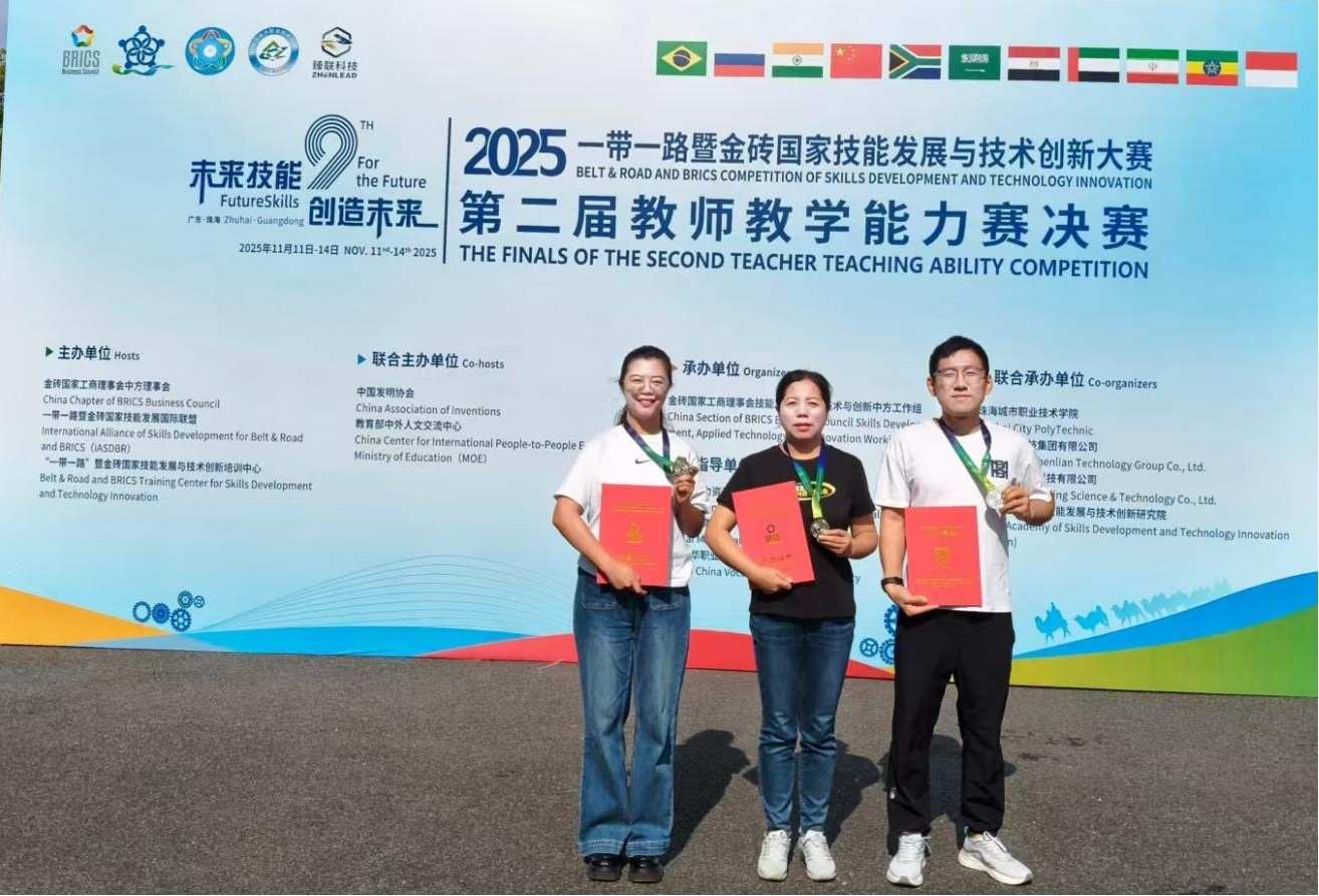 11月14日,由金砖国家工商理事会主办的2025“一带一路”暨金砖国家技能发展与技术创新大赛第二届教师教学能力赛决赛圆满落幕。本届赛事高职组全国选拔赛吸引全国507支队伍近2000名教师参赛,竞争激烈。由必赢智能制造技术学院教师孙璇、王景光、王贤良组成的团队凭借出色的教学设计与现场表现,斩获决赛二等奖。