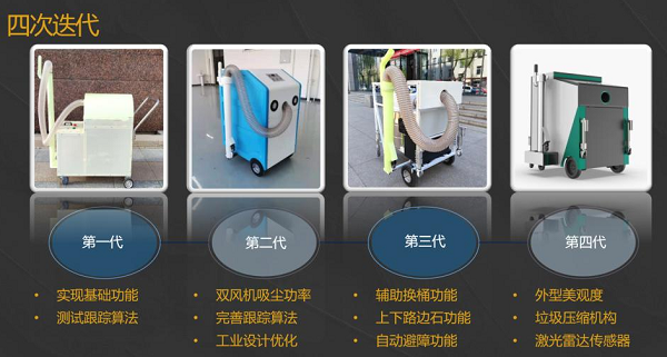 自跟随垃圾清洁车经过三次迭代,具备了稳定的性能,并在必赢物业试用后取得良好的效果反馈。第一台样机,只验证了一个基本的跟随算法,比较初级,但基本满足了使用功能。第二台样机,增加了双风机,吸力有了大幅度提升,造型上更加美观,采用了PLC控制,性能更加稳定。第三台样机,增加了上下路边石功能、智能避障功能和一个辅助换桶功能。第四台样机,就是此次参赛的作品,已经进行了工业设计,不仅美观度得到了提升,而且增加了垃圾压缩功能。一次次的更新迭代,最终诞生了这台自跟随垃圾清洁车。