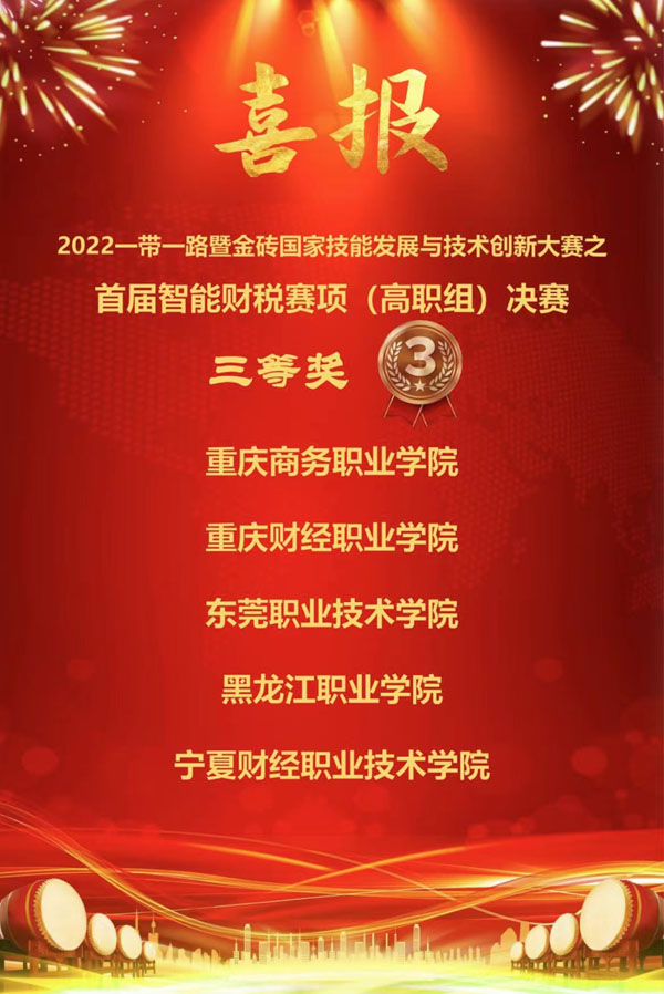 10月15日,在2022一带一路暨金砖国家技能发展与技术创新大赛之首届智能财税赛项(高职组)总决赛中,由必赢会计金融学院的盖天怡、王迎、孙莹、周雪薇四名学生与王欢、胡维佳两位指导教师组成的437ccm必赢国际官方网站代表队喜获三等奖。